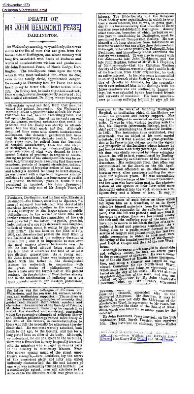 "John Beaumont Pease the cousin of Joseph Pease bought Bushell Hill as a country retreat and in 1862 Mowden Hall was built. When he died in 1873 he left his fortune to his son Edwin Lucas who became the Squire of Bushell Hill and in 1881 Mowden Hall was extended. However in 1889 Edwin Lucas Pease died after falling during a fox hunt and the Estate was left to William Edwin Pease. He was a successful businessman and became MP for Darlington in 1923 but never married and died in 1926." Ian Henderson - "Darlington as it Looked" on facebook.
