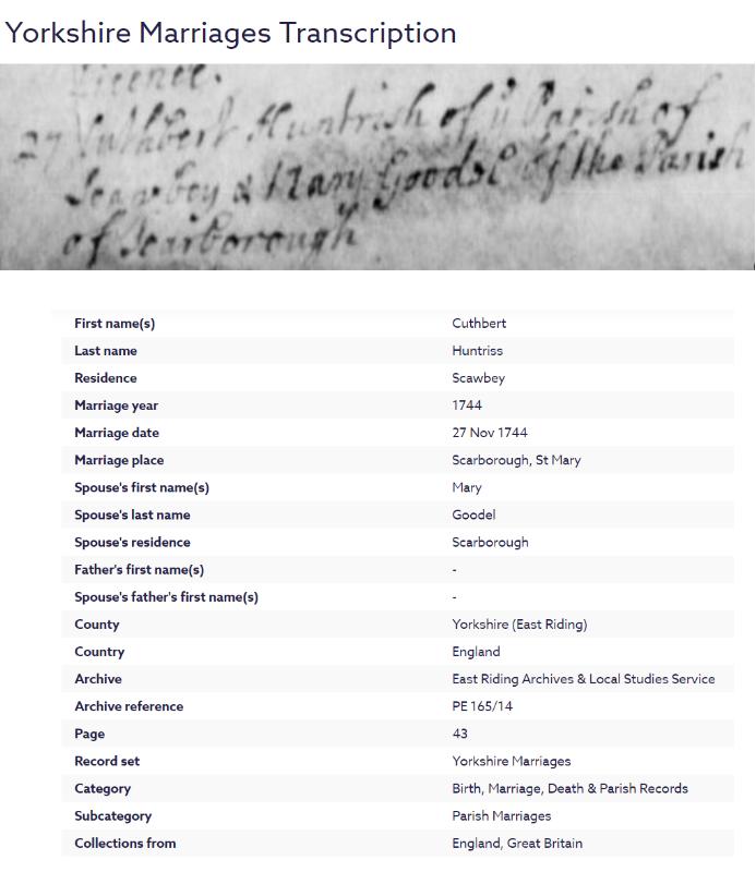 Son: Cuthbert HUNTRISS, 1744, age 27