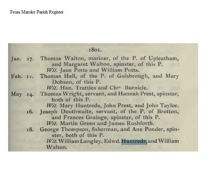 Marske Parish Register shows that both Mary and Edward Hundreds(sic) are witnesses at (separate) marriages within a few days.