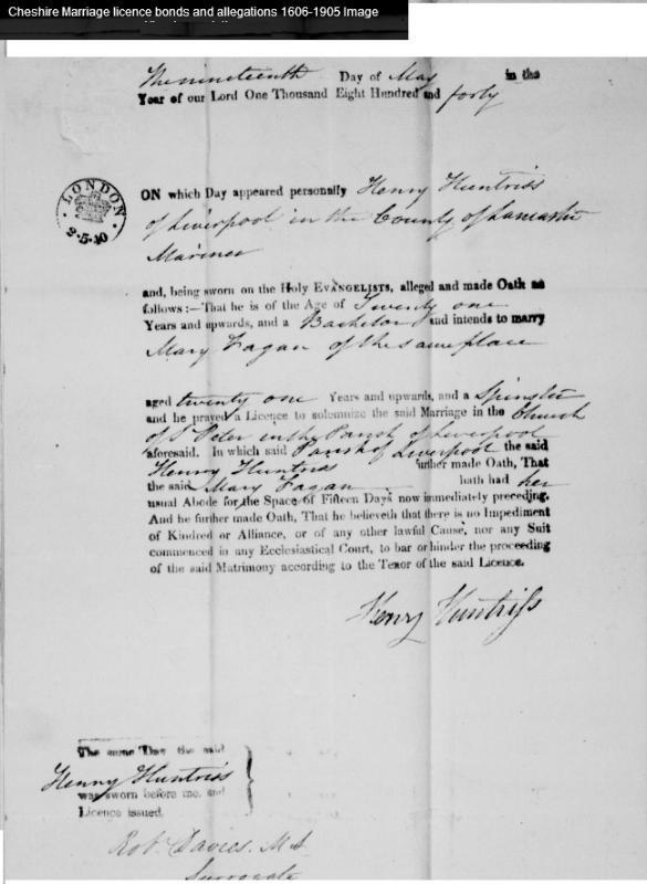 Marriage: 19 May 1840 St Peter, Liverpool, Lancashire, England Henry Huntriss - Full Mariner Bachelor of Kitchen St Mary Fagan - (X), Full Spinster of Kitchen St Groom's Father: Henry Huntriss, Broker Bride's Father: John Fagan, Shipwright Witness: George Norman; Dora Doyne Married by Licence by: John Cheetham A M Curate Register: Marriages 1839 - 1840, Page 189, Entry 378 Source: LDS Film No 94059