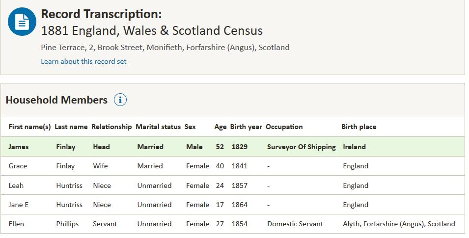 Assumed to be daughter of Mary & John by association with Leah Huntriss: both are described as being nieces of James and Grace Finlay with whom they were living at the time of the 1881 census.