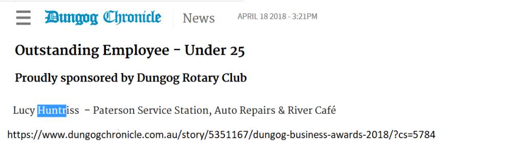 Commended in the Aug 2013 Paterson Post (newsletter of the PatersonPublic School in New South Wales) for "Running her best at