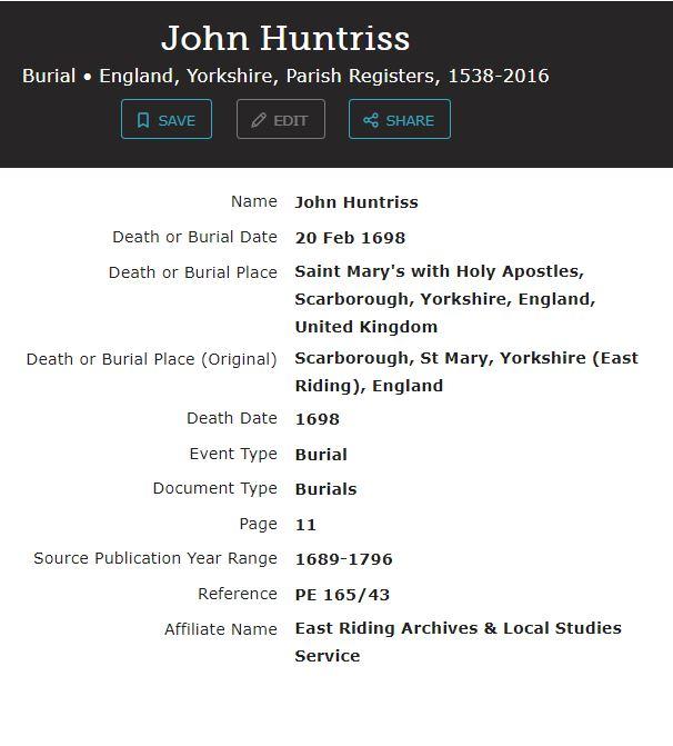John HUNTRISS, 1698
