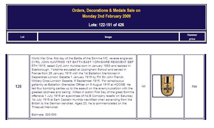 128. World War One, first day of the Battle of the Somme MC, reverse engraved CYRIL JOHN HUNTRISS 1ST BATTN EAST YORKSHIRE REGIMENT SEP 6TH 1915, cased Cyril John Huntriss born in January 1893 and resided in Scarborough, Yorkshire educated at Uppingham School and served in France from 26 January 1915 with the 1st Battalion Mentioned in Despatches London Gazette 1 January 1916 by FM Sir John French, Military Cross London Gazette, 6 September 1915, 'For conspicuous gallantry as Battalion Grenadier Officer on 9 August 1915 at HOOGE. He led four bombing parties up to the assault on the enemy's position with the greatest coolness and daring'. Killed in action First Day of the great Somme offensive 1 July 1916 an eyewitness of his B Company recalls 'on Saturday 1st July 1916 at 8am Captain Huntriss was killed when advancing from the British to the German trenches'. Aged 23, he is commemorated on the Thiepval Memorial. Estimate: 300-500