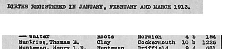 - Thomas HUNTRISS's siblings: Jane Anne HUNTRISS (1906- ), Frederick HUNTRISS (1907-1972), Violet HUNTRISS (1909- ), Gilbert HUNTRISS (1911-1916), Gertrude HUNTRISS, Doris B HUNTRISS (1916-1997), Richard Holloway HUNTRISS (1918-1983), Edith HUNTRISS (1919- ), Isabella HUNTRISS (1924- ), George G HUNTRISS (1926-1926), Thomas G HUNTRISS (1926-1926), Ronald HUNTRISS, Queenie HUNTRISS (1929- ) and Jenny HUNTRISS ( - )