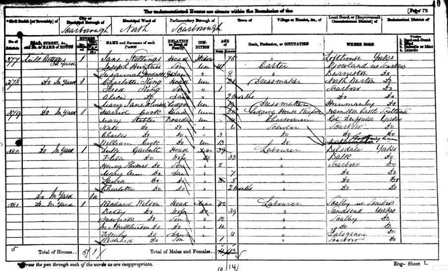 1871 Census - living (unmarried) at Gowland, Nr Scarborough at Mill Cottages In Yard, Scarborough, Carter.