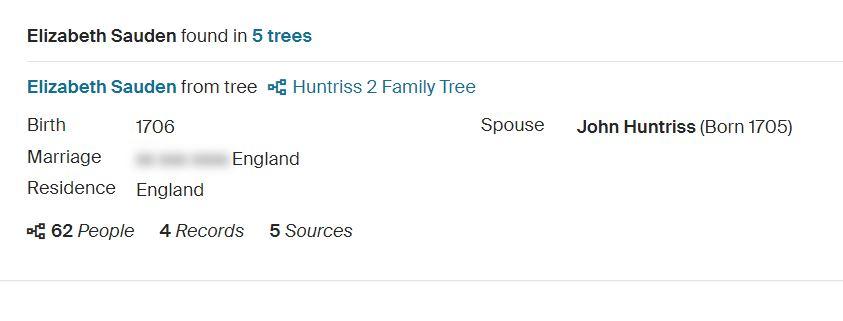 There's a Family Tree on Ancestry.com suggesting that John Huntriss b 1705 married Elizabeth Saudon (sic) b 1706