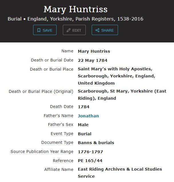 Mary HUNTRISS, 1784, age 1